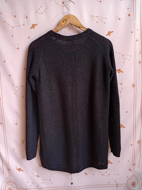 Tricô preto em excelente estado, sem bolinhas e com toque macio. O modelo é mais comprido, criando um caimento elegante e versátil — perfeito para usar com jeans, leggings ou peças de alfaiataria. Veste bem tamanhos P e M, adaptando-se ao corpo com leveza.